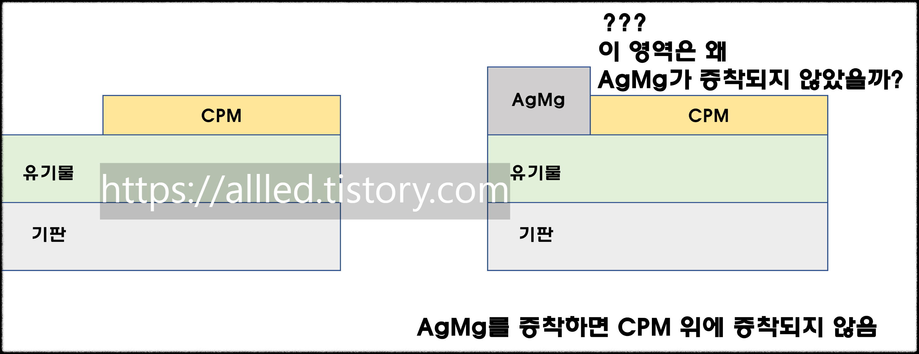 그러면 오픈 마스크로 전체 영역에 AgMg를 증착하는데 왜 CPM 위에는 AgMg가 증착되지 않을까요??