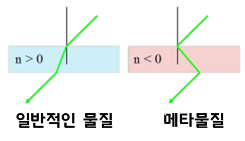 지구상에 존재하는 대부분의 물질들(빛이 통과할 수 있는 물질에 한해서, 통과를 못한다면 굴절이라는 현상 자체가 성립하지 않는다) 굴절률이 1보다 큽니다. 1보다 크다는 것은 0.544 이런 식으로 소수점을 가지는 재료조차 없다는 이야기인데 메타물질은 무려 마이너스 굴절률을 가지는 특이한 상황인 것이죠.