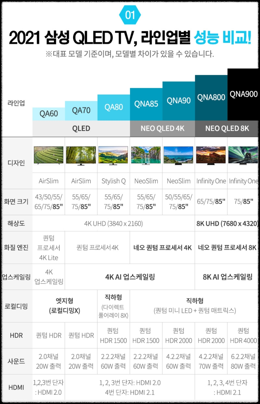 아래 삼성 TV 라인업을 보고 차이점으로 내세우는 기술들을 비교해보겠습니다.