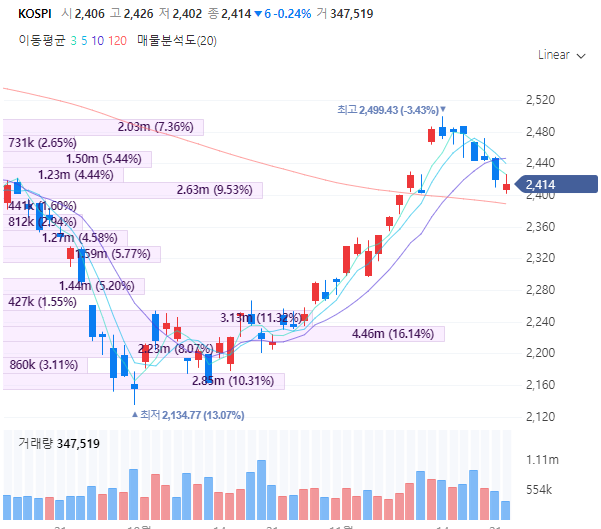 우리나라 코스피도 어제를 기점으로 10일 이동평균선을 뚫고 내려왔기 때문에 단기 조정국면에 들어갔다고 볼 수 있습니다. 이평선을 기준으로 단타매매를 중지하고 매매를 하는 기준으로 삼는 저로서는 증시가 다시 상승 추세가 나오기 전까지 휴식시간이라고 볼 수 있겠네요.