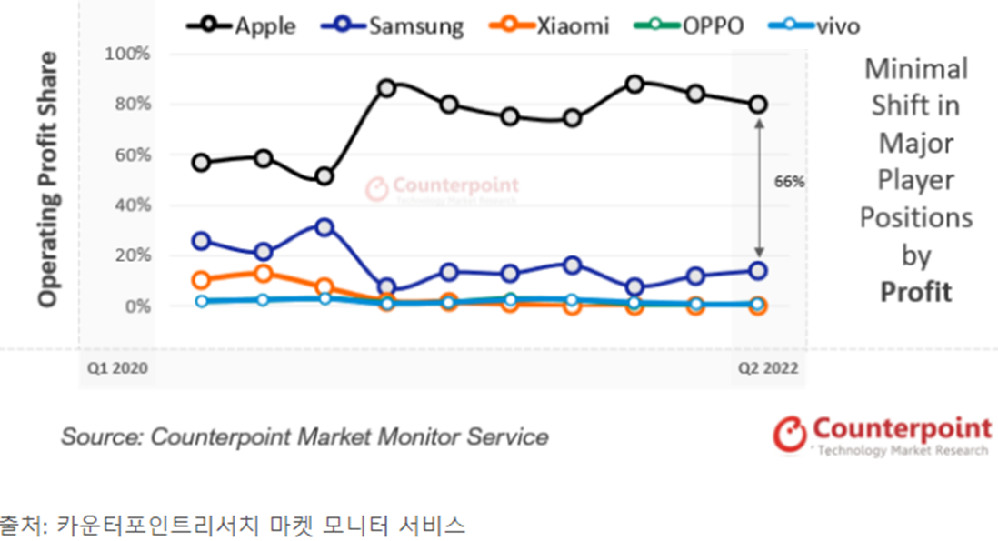 물론 판매량 기준으로 보면 삼성의 점유율이 18%, 애플이 13% 수준으로 삼성이 앞서지만 사실상 모든 이익은 애플이 다 가져가고 있는 기형적인 구조라고 볼 수 있습니다.