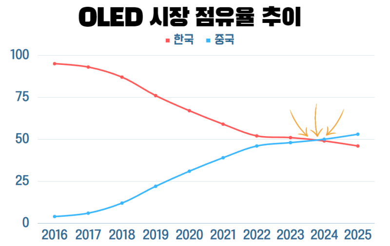 우리나라의 압도적이었던 OLED 점유율이 이제 올해 혹은 내년 쯤 중국에 역전될 것으로 보입니다.